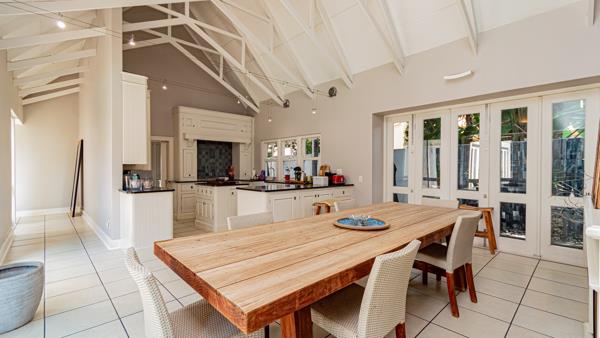 From the moment you enter, you are welcomed by a breathtaking open-plan living space bathed in natural light. Soaring vaulted ceilings with striking exposed trusses add architectural drama, while the soft neutral palette creates an atmosphere of calm sophistication. The lounge flows seamlessly into a stylish dining area and a gourmet designer kitchen the heart of the home complete with high-end finishes and a separate scullery that keeps the main space pristine and functional.