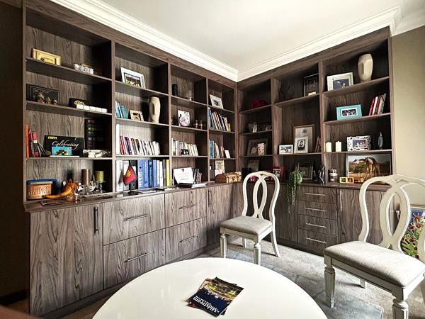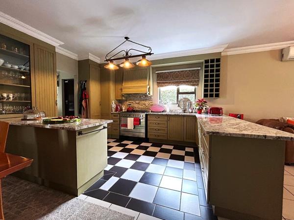 A grand double-volume foyer welcomes you into expansive, light-filled living areas that flow seamlessly throughout the home. The open-plan layout includes a spacious lounge, dining room, kitchen nook, and a stunning French-style kitchen with granite finishes, a gas stove and a separate scullery accommodating three under-counter appliances.