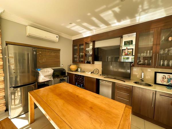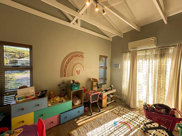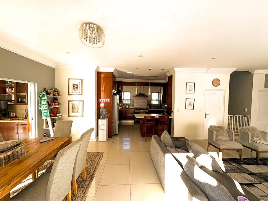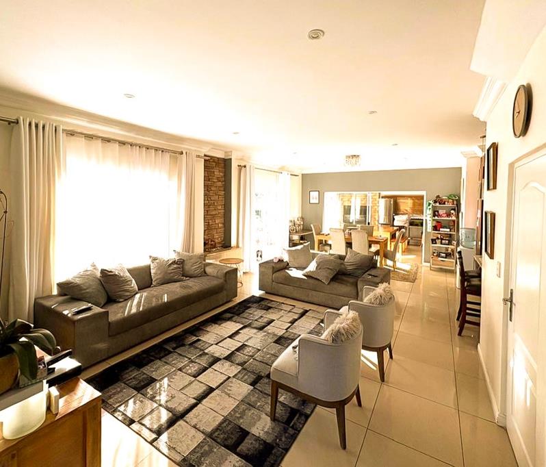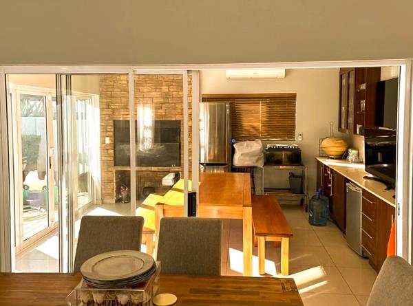 - The lounge opens to an enclosed braai area that leads seamlessly into the large garden and heated pool.