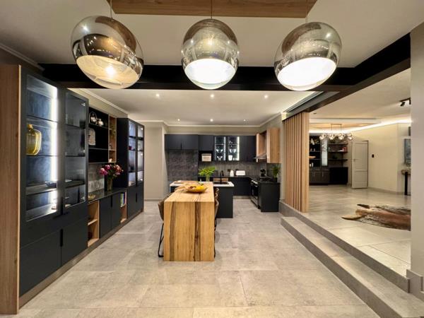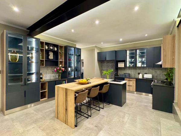 The modern entertainers kitchen is fitted with gas appliances and high-end finishes, complemented by a separate scullery with ample space for all your appliances. Adjacent living areas flow effortlessly onto a large patio with a built-in braai and bar area, ideal for hosting friends and family.