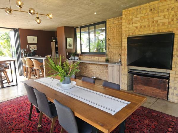 Outdoor living is a breeze with a lovely enclosed entertainment area, built in braai a private swimming pool with heat pump and outside paved area. The property is pet-friendly, so your furry friends are welcome, regrettably no cats! With three garages and storage spaces, there''s plenty of room. Enjoy year-round entertaining with a built-in braai in the open-plan area and a cozy fire place for cooler evenings.