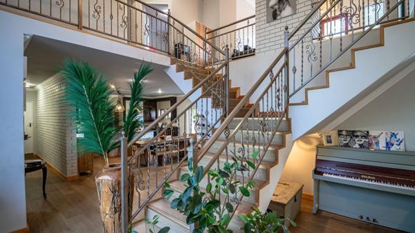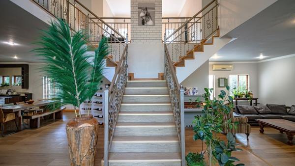 Upstairs, the staircase separates into two wings, creating a thoughtful layout that provides privacy for the main suite while keeping the family connected. The generous main bedroom occupies its own wing and serves as a peaceful retreat, complete with a large wardrobe area and a spacious en-suite bathroom featuring a double basin, bathtub and shower.