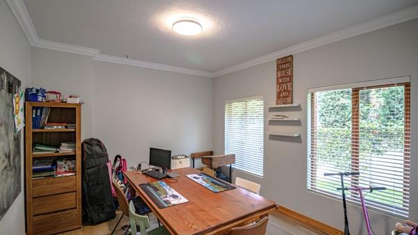 Adjacent to the study, a spacious family lounge offers a comfortable retreat for evenings at home or gathering with loved ones. Throughout the home, laminated flooring adds warmth and a modern finish, enhancing the inviting atmosphere of each space. The windows are fitted with all white blinds, creating clean and fresh window dressings.