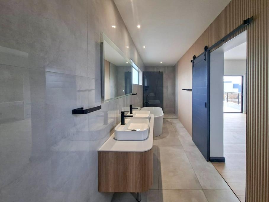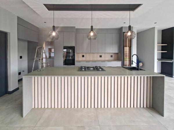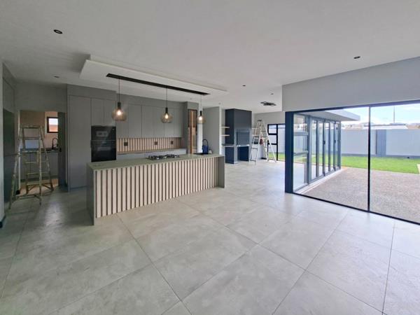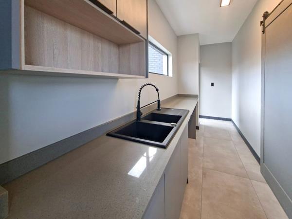 The lounge and contemporary kitchen flow effortlessly onto a covered patio, complete with a built-in braai and prep counter, creating the perfect setting for indoor-outdoor entertaining. The patio overlooks a spacious garden with a sparkling pool, offering ample room to enhance and personalise the outdoor space. The kitchen is both functional and sophisticated, featuring a central island with a prep bowl that doubles as a breakfast counter, as well as a separate scullery with access to the kitchen yard.