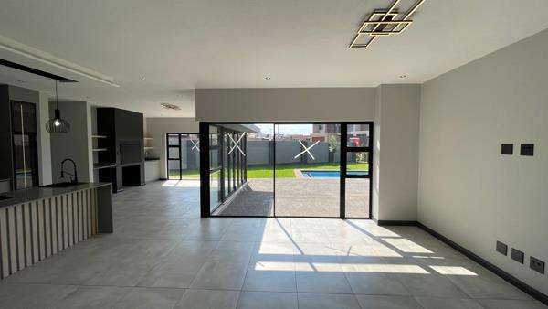 Large openings extend to a covered patio with a built-in braai, perfect for indoor-outdoor entertaining overlooking the pool.