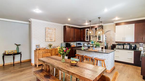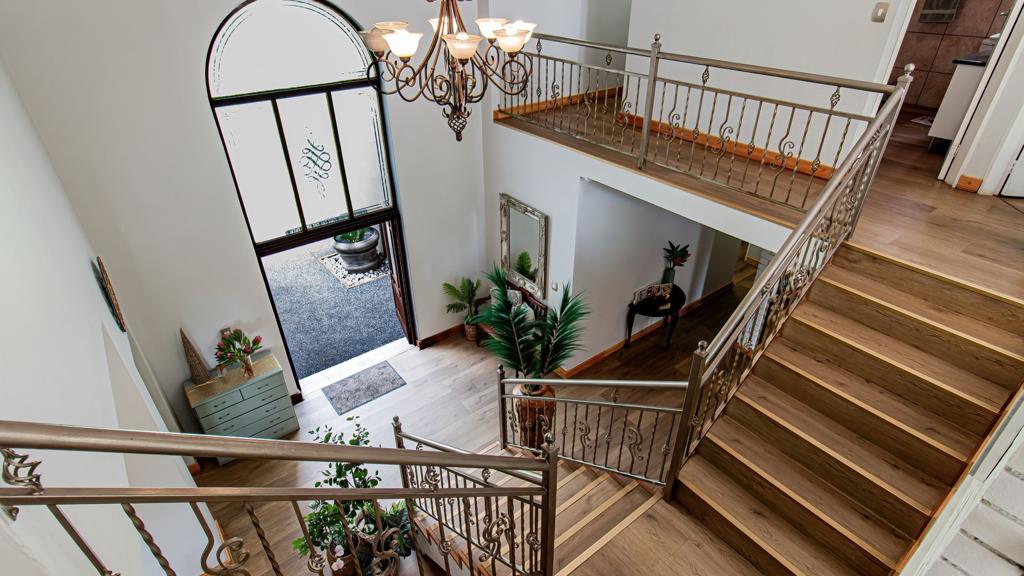 The four bedrooms provide comfortable accommodation, with two benefiting from private en-suite bathrooms. Outdoor living is equally impressive, featuring a balcony, a large patio, and a deck overlooking a refreshing swimming pool perfect for enjoying the South African climate. An integrated braai room enhances entertaining possibilities, complemented by a garden and convenient staff quarters with seperate toilet.