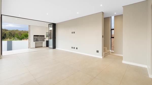 Outdoor Entertainment: Step out onto the open patio, featuring a built-in braai and countertop with a prep bowl, perfect for entertaining. A guest toilet is conveniently located next to the patio for easy access.