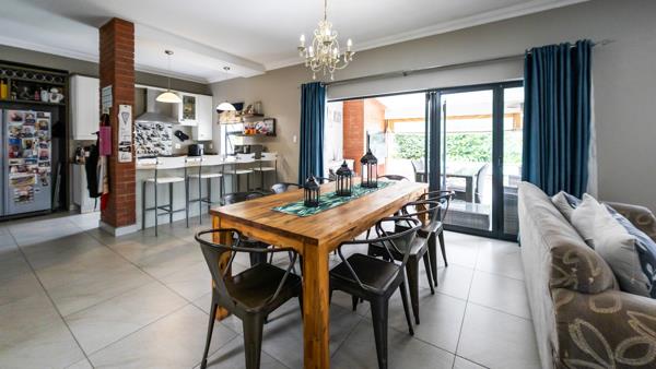 The undercover patio, allows you to shape the space according to the season. Open it up to welcome summer breezes or create a cozy retreat during cooler evenings. Beyond, a generous sparkling pool invites endless summer enjoyment, while the boma area sets the scene for relaxed evenings around the fire. The garden offers generous lawn space, ideal for children and pets to enjoy safely within the estate.