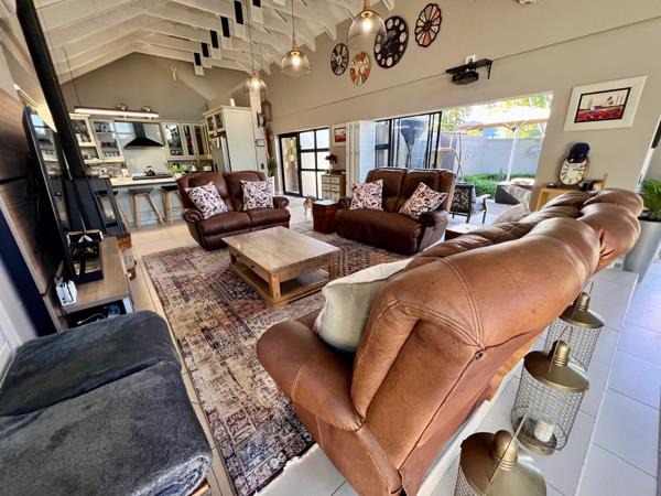 The home flows beautifully, with seamless open-plan living spaces that create a welcoming and airy atmosphere. The living and dining areas are spacious, with tiled floors throughout and an anthracite fireplace in the lounge for those cozy winter evenings.