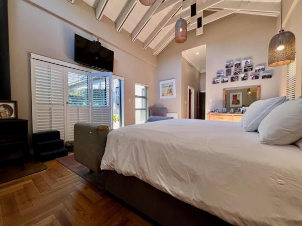 The dining area features a built-in braai and sliding doors leading to the garden, offering the perfect indoor/outdoor living experience.