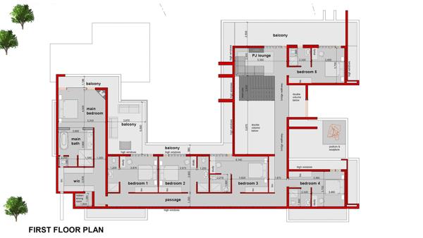 The walkway lets you enjoy the double volume on both sides on your way to a podium with a sculpture before reaching the passage to the remainder of the bedrooms. There are 4 bedrooms in the passage, all with en suite bathrooms with showers leading to the main bedroom.