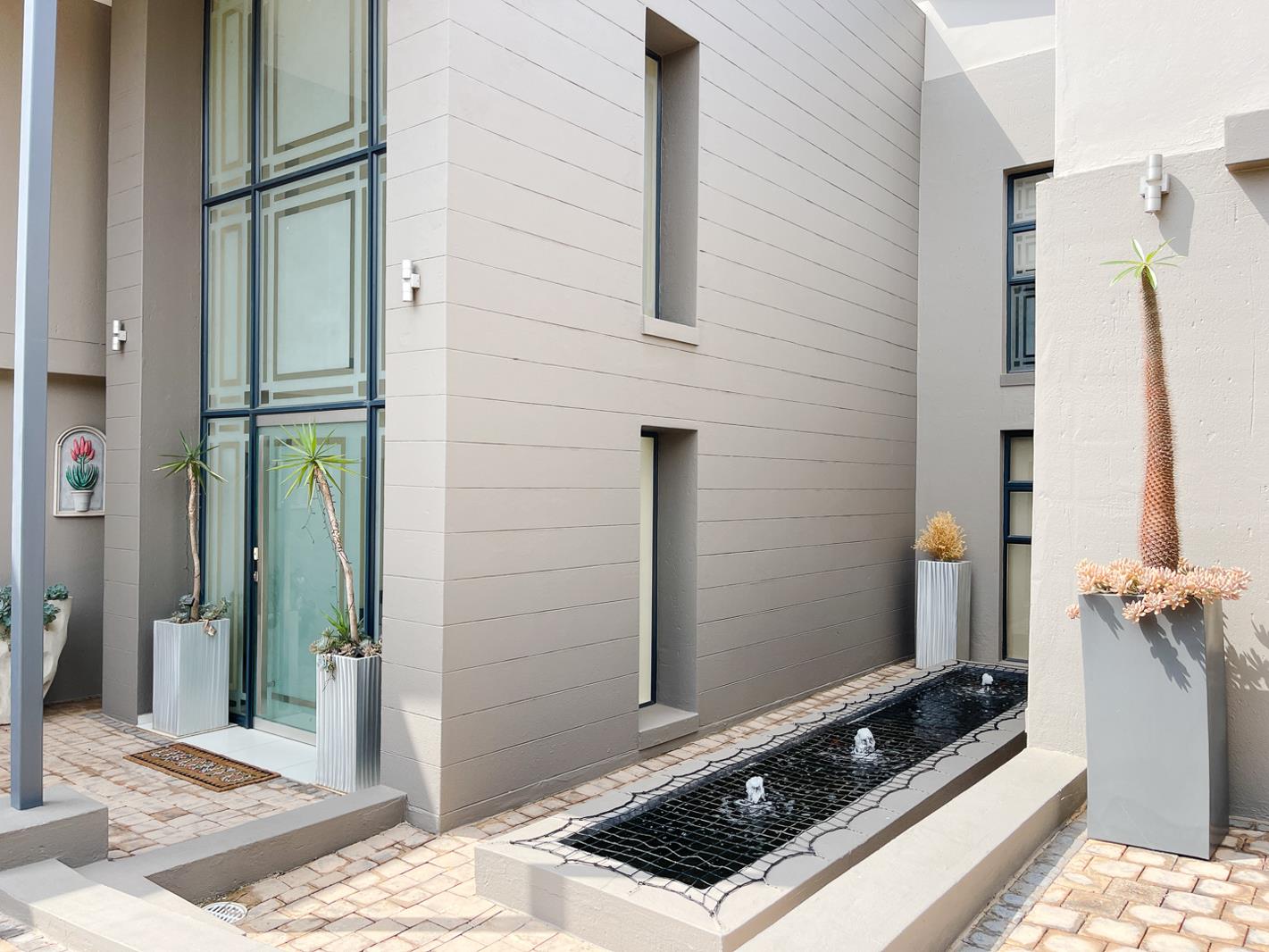 The Koi Pond at the front of the entrance is solar and provides ambiance to the faade of the house. There are 2 x 2 extra lengths with garages, one housing the Deye solar system and the other a workbench, tool stack system, irrigation panel, and cupboards for storage.
