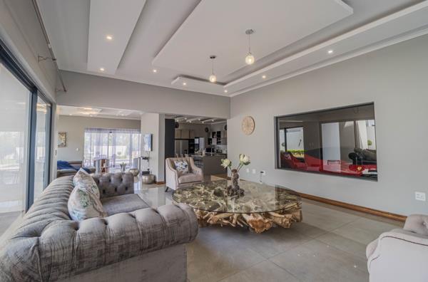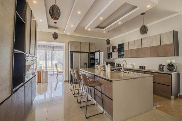 The property offers so much style, elegance, delightful flow and abundance of natural light throughout. A modern semi-open plan kitchen with an island, breakfast nook, modern tops, gas stove, and a separate scullery with ample cupboards, which is centrally located between the dining roomindoor patio with built-in braai and TVLounge. The beautiful bulkhead ceilings throughout the house create the ambiance of tranquility.