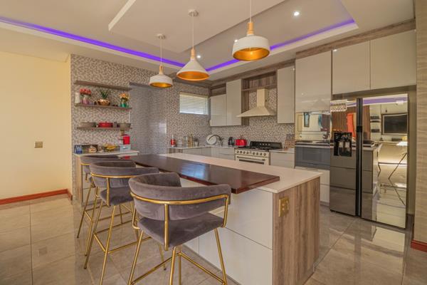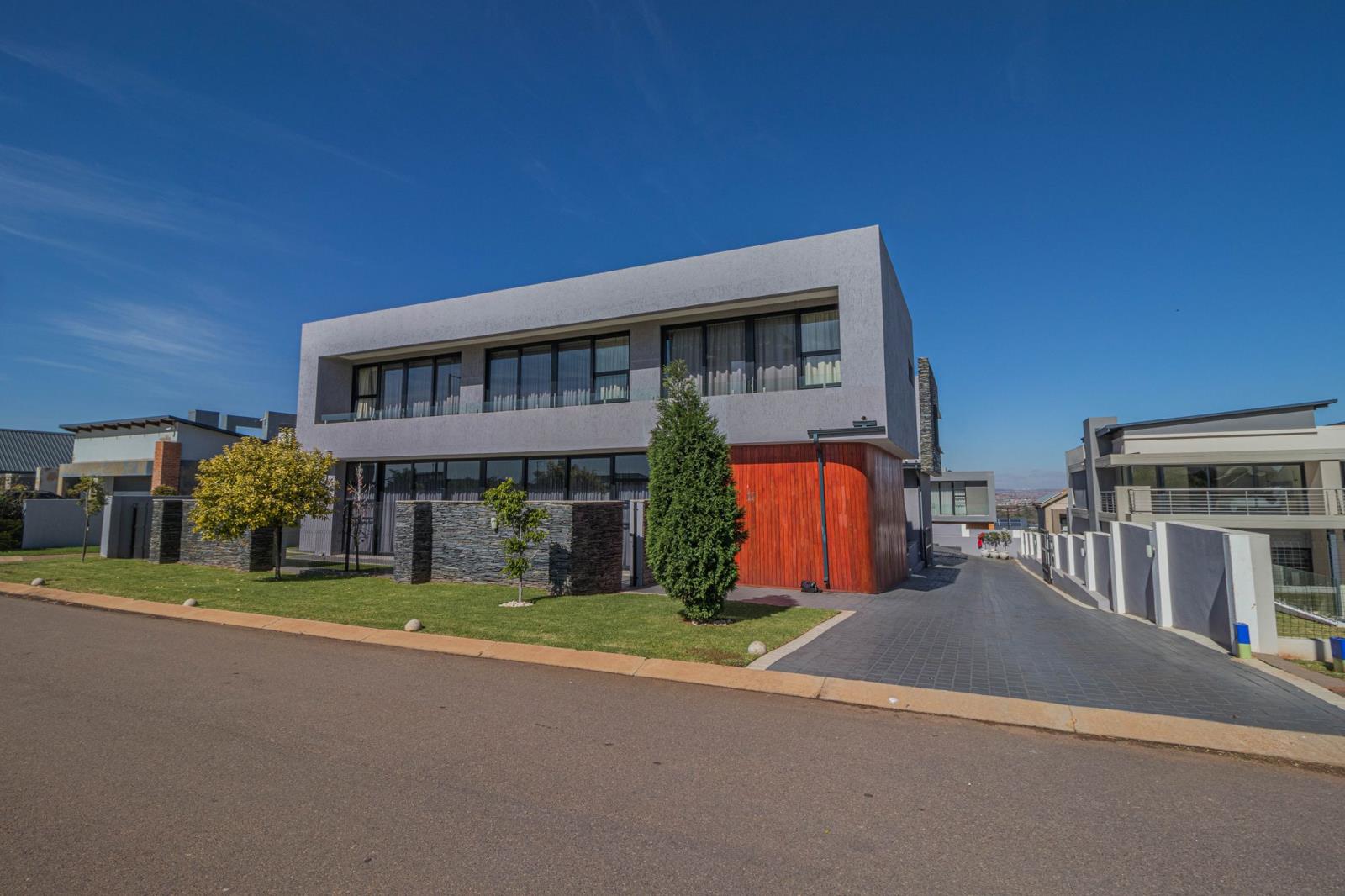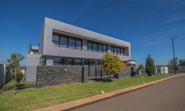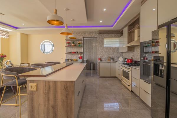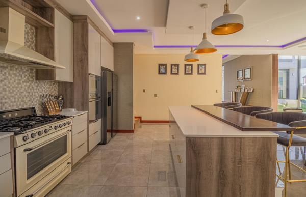 The home offers 5 air-conditioned, en-suite bedrooms, including a luxurious main suite with a walk-in closet and elegant bathroom. Extras include a pyjama lounge, cinema room, study, staff quarters, 4 garages, balconies, surround sound, full WiFi, and a solar system with 12 panels and backup power.