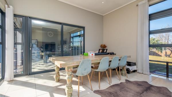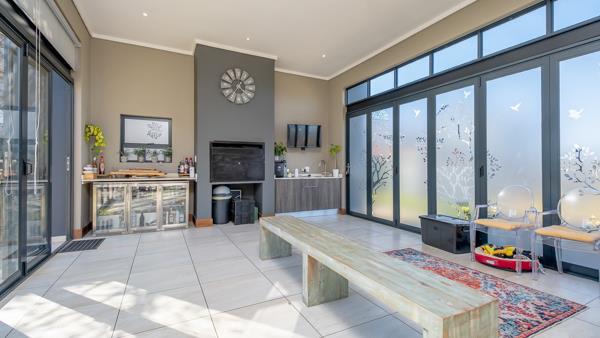Discover contemporary living at its finest with this modern and spacious 4-bedroom home, ideally positioned in sought-after Midstream Ridge Estate. Designed to embrace natural light, the home features large windows and glass panels throughout, allowing lots of sunlight to come in.. Downstairs, the welcoming lounge with a cozy fireplace flows into an entertainment room with a built-in braai and stacking doors that open to the private garden, perfect for year-round entertaining. The open-plan kitchen impresses with a large center island, gas stove, walk-in pantry, ample cupboard space, and a separate scullery and laundry. A back door leads to a full staff room with its own bathroom. The ground-floor main bedroom offers luxurious comfort with laminated flooring, air conditioning, walk-in closets, and a full ensuite bathroom. A second downstairs bedroom features built-in cupboards, air conditioning, and its own ensuite bathroom. A guest toilet adds convenience. Upstairs, youll find a functional study nook and two additional bedrooms, both equipped with air conditioning, built-in cupboards, and private ensuite bathrooms. Additional features include:Triple garages and plenty of visitor parking, fenced-in swimming pool for peace of mind, Solar panels and Solar geyser for energy efficiency. Private gate offering direct access to the green belt, trailer gate. This exceptional property combines style, space, and sustainable living in one of Midstream Ridges most peaceful and exclusive settings, truly the ideal family home. Call me to book a viewing appointment.