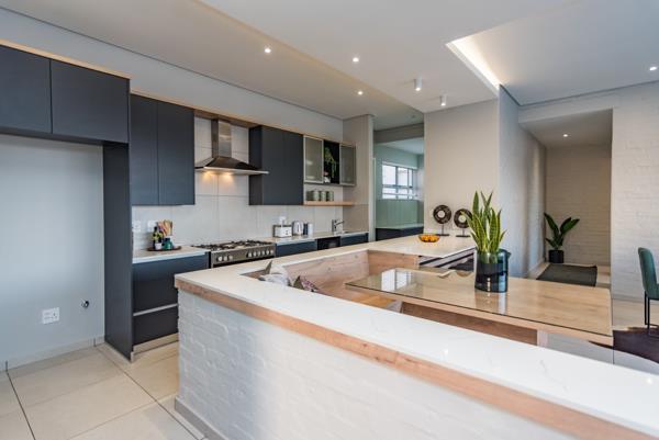 The cafe style kitchen with conversational style built in dining table is a unique and inviting feature