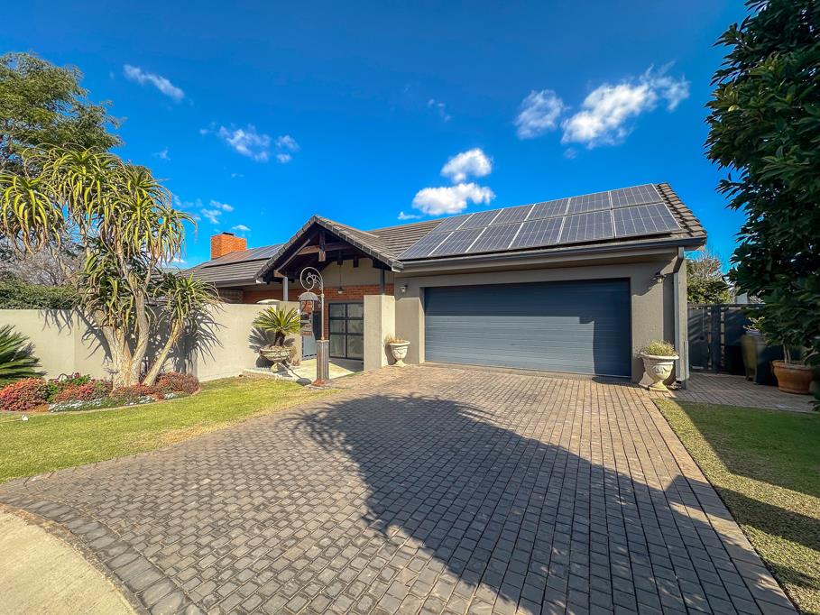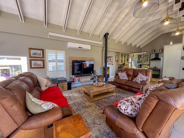 Step inside to a charming foyer that seamlessly flows into expansive open-plan living spaces. High-volume ceilings and exposed roof trusses create an airy, sophisticated atmosphere, complemented by abundant natural light. The lounge features a cozy gas fireplace, while the dining area is perfectly positioned in the enclosed patio with a built-in braai and extra cabinetry an entertainers dream.