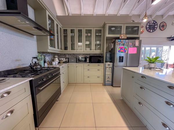 The gourmet kitchen is thoughtfully designed with a private scullery, a generous pantry, space for three appliances, and a heat pump for water efficiency. All windows are adorned with sleek American blinds for a clean, contemporary finish.