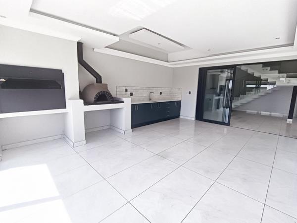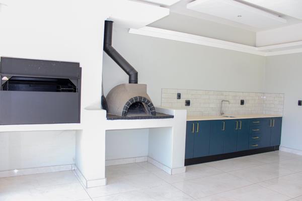 Entertainers Dream: Step into your exquisite braai room featuring a state-of-the-art pizza oven, ideal for hosting unforgettable gatherings with friends and family. The ease of indoor-outdoor living opens up to a meticulously landscaped garden.