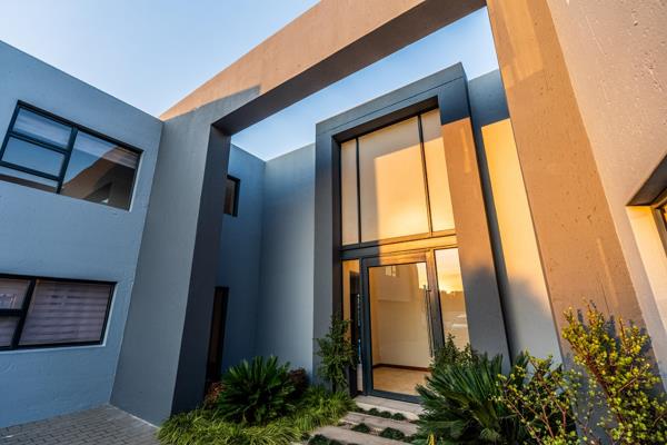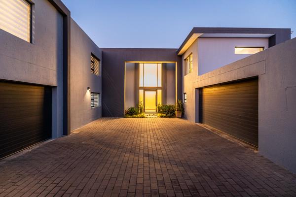 The enclosed entertainment patio with built-in braai opens through large sliding doors to a private garden and heated swimming pool ideal for year-round entertaining.