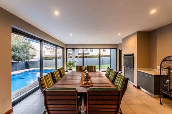 You will enjoy the spacious enclosed patio with its built-in-braai and amazing view over the sparkling pool and green garden ideal to entertain family & friends!
