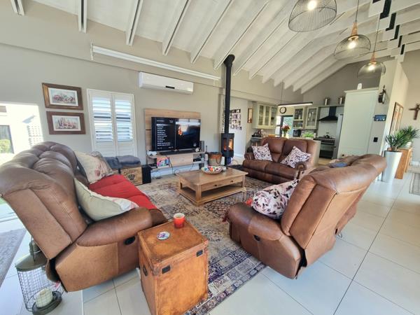 This beautifully designed single-storey residence offers the perfect balance of space, style, and functionality. Set on an +-826m stand with +-324m under roof, the home welcomes you through a spacious entrance hall that opens into expansive living areas. The open-plan layout includes two inviting lounges, a family or TV room, and a dining area that effortlessly connects to a covered patio featuring a built-in braai ideal for entertaining and relaxed outdoor living.