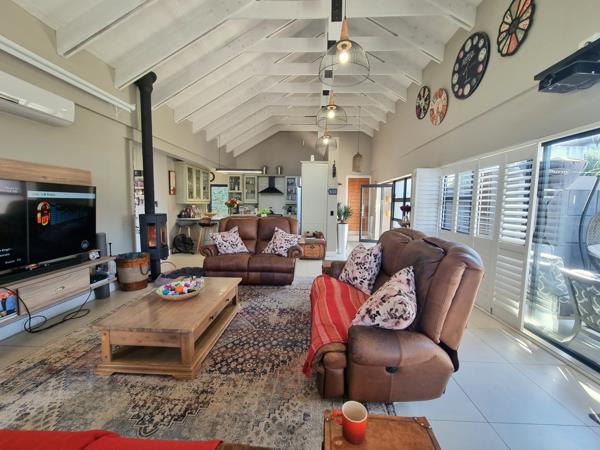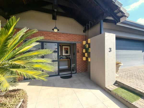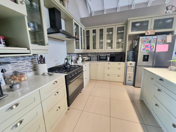 The heart of the home is a modern kitchen fitted with a gas stove, sleek built-in cupboards, and a separate scullery, offering both practicality and sophistication. Large windows and sliding doors fill the living spaces with natural light, creating a seamless flow between indoor comfort and the beautifully landscaped garden. The patio overlooks a sparkling pool and manicured lawn, enhanced by an automated irrigation system for easy maintenance.