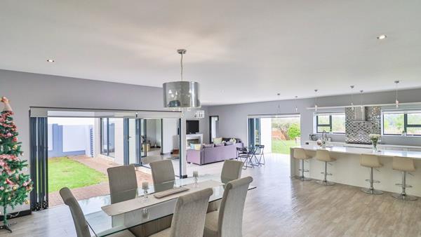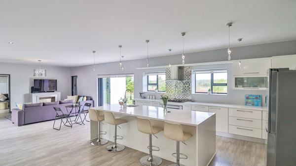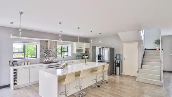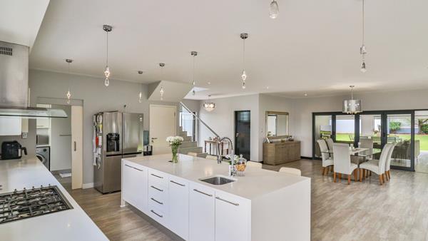 The beautifully appointed kitchen features a large centre island, sleek white cabinetry, elegant pendant lighting, and a spacious scullery tucked behind the main cooking area. It effortlessly connects to the dining room and multiple lounge spacesideal for entertaining, family gatherings, and everyday comfort.