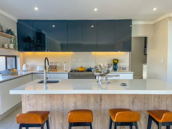 Open-plan kitchen with a gas stove, scullery, and breakfast bar.