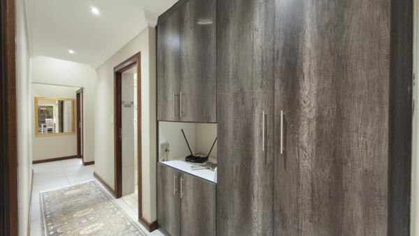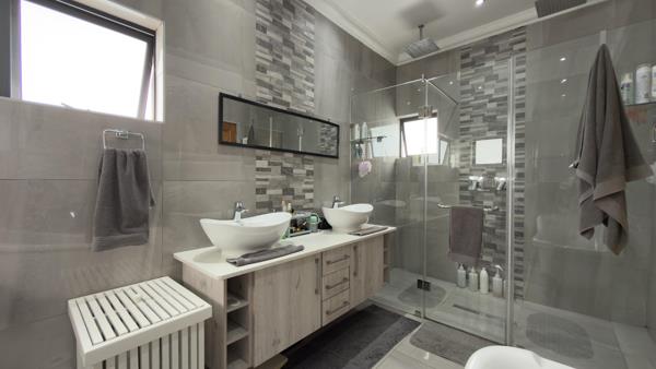 Large aluminium stacking doors open onto the covered patio with built-in braai, creating an ideal indoor-outdoor entertainment space overlooking the private, landscaped garden. There is room to add a pool or boma area, making this home perfectly suited for relaxed family living.