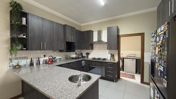 From the moment you enter, the welcoming foyer leads into spacious open-plan living areas that flow seamlessly from covered patio to lounge to dining room and into the heart of the home a contemporary kitchen fitted with a centre island, gas stove, quality cabinetry, and a separate scullery accommodating three appliances including space for a top loader washing machine.
