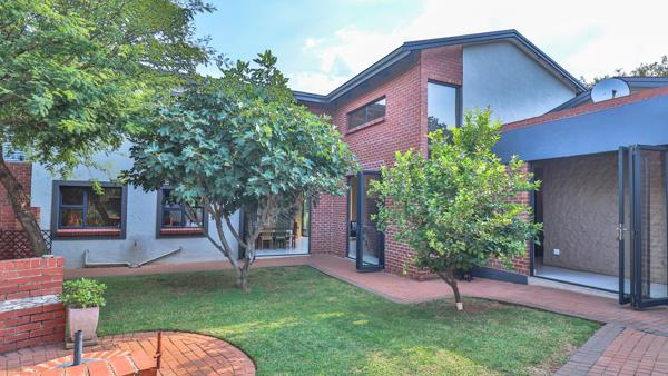 Outdoor boma braai overlooking a landscaped garden with large established trees