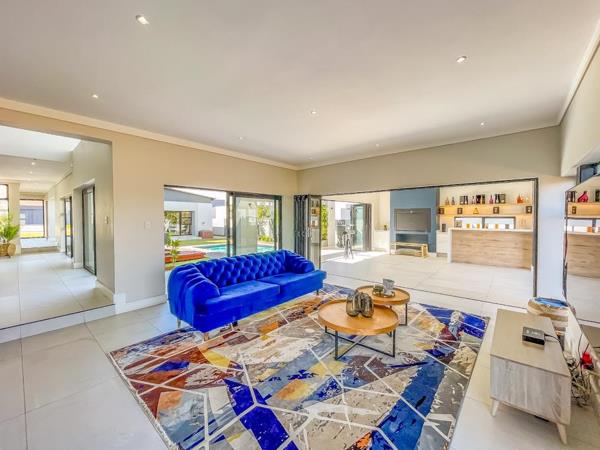 Spacious open-plan living areas, including lounge, dining, and a stylish enclosed patio with a built-in braai and bar, perfect for entertaining. The patio opens to a sparkling pool and a wooden deck overlooking a beautifully manicured garden.