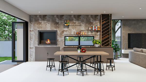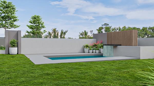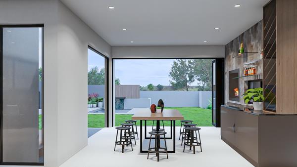 The main living area is designed for comfort and style, featuring a lounge, dining room, and an open-plan kitchen that flows seamlessly onto a covered patio. The patio is equipped with a built-in braai and countertop, ideal for entertaining. Large stacking doors lead out to the garden, where a beautiful pool with a water feature awaits, and theres additional space to customize this outdoor area with more amenities.