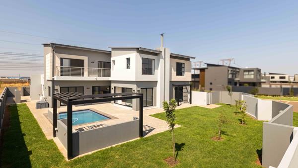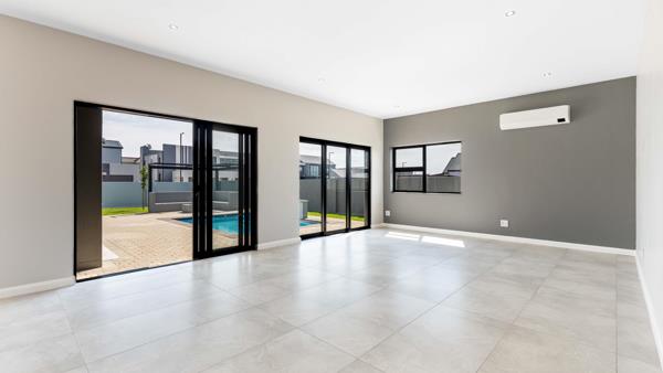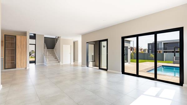The home opens into a bright and spacious living area, seamlessly combining the kitchen, dining room, lounge, and covered patio. The patio features a built-in braai and overlooks the pool, landscaped garden, and a BOMA with firepit and built-in seating. With ample space in the garden, you can easily add more amenities to suit your lifestyle.