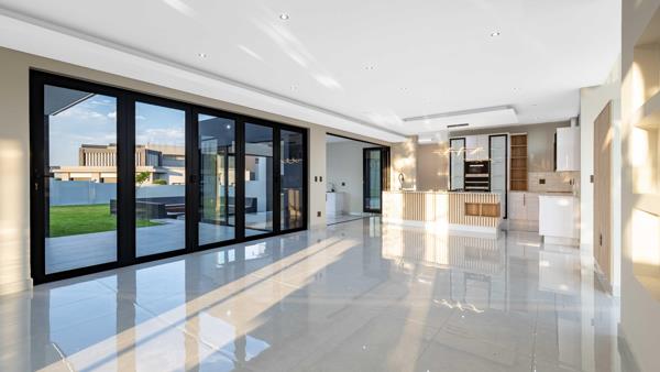 Enter through the covered porch into the impressive double-volume foyer, setting the tone for the spacious open-plan layout. The living area seamlessly integrates the lounge, dining room, and a modern kitchen with a central island serving as a breakfast nook. A separate scullery provides direct access to the triple garage, kitchen yard, and staff quarters with an ensuite bathroom.