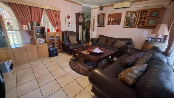 The home offers three well-sized bedrooms, all with built-in cupboards. The main bedroom features a brand-new air conditioner for added comfort. The second bathroom includes a spa bath, basin, and toilet, while the main en-suite bathroom offers a large shower, basin, and toilet. Additional built-in cupboards in the spacious passage provide ample linen and storage space.
