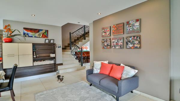 MODERN ARCHITECTURAL ELEGANCE. This modern, stylish double-storey residence reflects a refined collaboration between the owner and interior designer, resulting in a home where contemporary design and modern sophistication meet effortlessly. A striking oversized glass door welcomes you into an impressive double-volume entrance hall, enhanced by a wrought iron staircase and seamless flowing tiled floors that create an immediate sense of space and elegance. Guest toilet facilities.