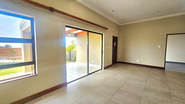 124m² Single level home offering 2 spacious LIVING ROOMS and UNDERCOVER PATIO. 2 bedrooms and 2 bathrooms . The main bedroom has a spacious full en-suite-bathroom. Ample cupboard space. Lovely well-maintained garden and a single lock-up double garage.