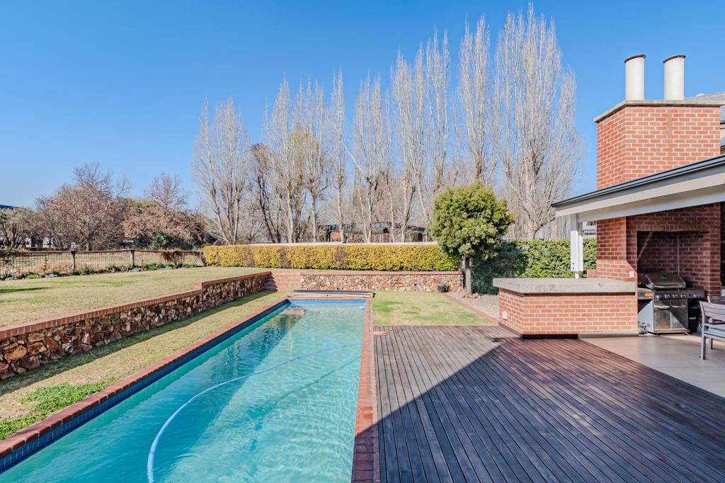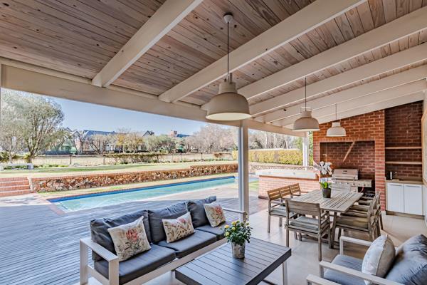 Sliding doors opens onto the undercover patio fitted with a built-in braai that overlooks the tranquil pasture. The landscaped garden features a salt-water lap pool and boma and play area.