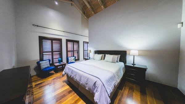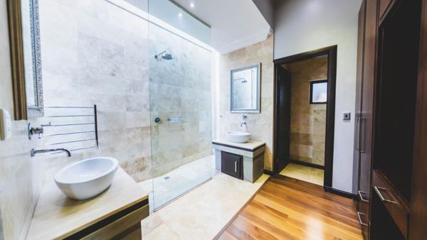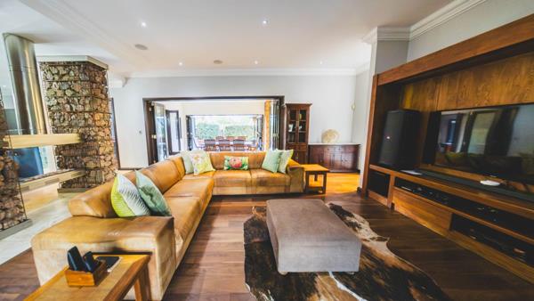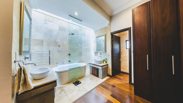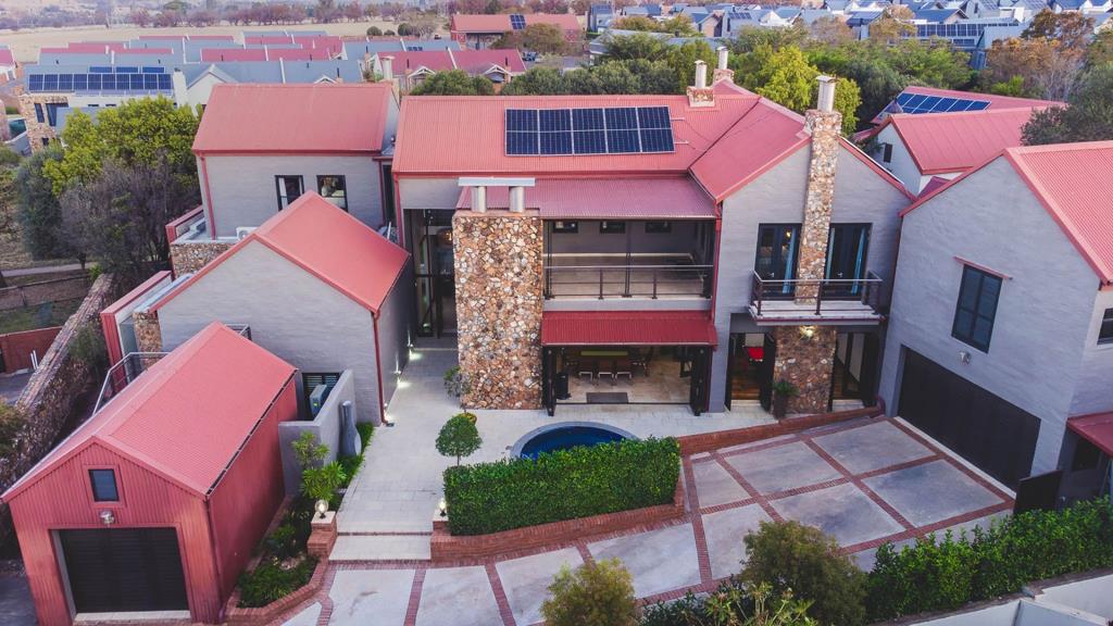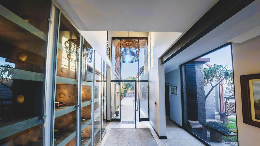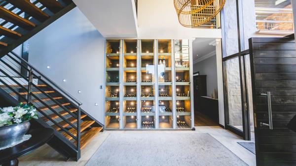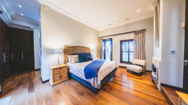 Upon entering, youre greeted by a striking glass-enclosed wine display, a true statement piece. The home features two generously sized bedrooms on the ground floor level, each with luxurious en-suite bathrooms and walk-in closets. One of these is the expansive master suite, complete with laminated flooring, gas fireplace, air-conditioning, and private access to a small, serene garden. The second ground-floor bedroom opens out to the main garden, where youll find a sparkling summer pool perfect for warm afternoons. The heart of the home is a large open-plan family room, also boasting a gas fireplace, that flows seamlessly into the kitchen. Adjacent to this is an entertainment room featuring a wood and gas braai, and stackable doors that lead to a heated pool, ideal for year-round entertaining. A thoughtfully placed dining room enhances the space, located just off the kitchen for effortless hosting. The modern kitchen is a chefs dream, offering a gas hob and electric oven, integrated coffee machine, ample storage, and sleek, high-end finishes.