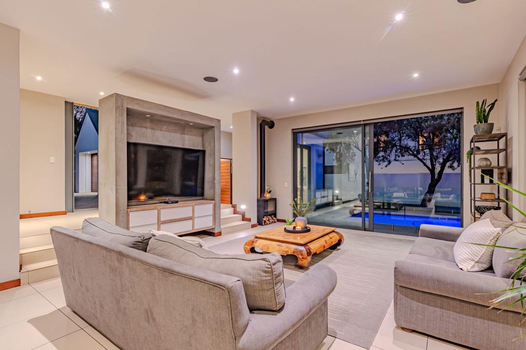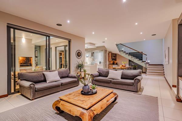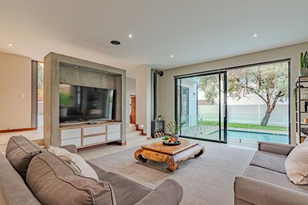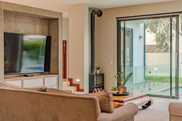 The indoor braai area is fully equipped with a wood-burning braai and extractor fan a gas point installed, prep bowl, and stacking doors opening onto the manicured garden and sparkling heated swimming pool ideal for relaxed family living.