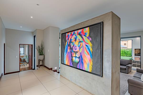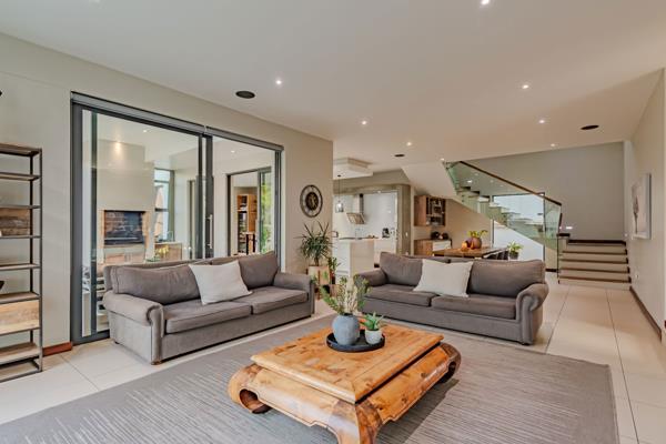Adjacent to the kitchen lies a fitted bar and entertainment area, complete with sliding doors leading out to the garden and indoor braai space. A Piazzetta Pellet Stove adds warmth and charm during the cooler months. The expansive living areas flow seamlessly together, with the dining space easily accommodating large family gatherings. The family tvlounge area features a cosy wood fireplace, creating the perfect ambience for both intimate evenings or lively gatherings.