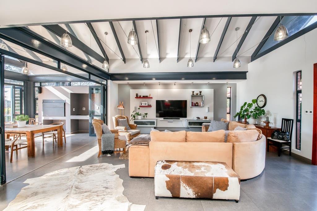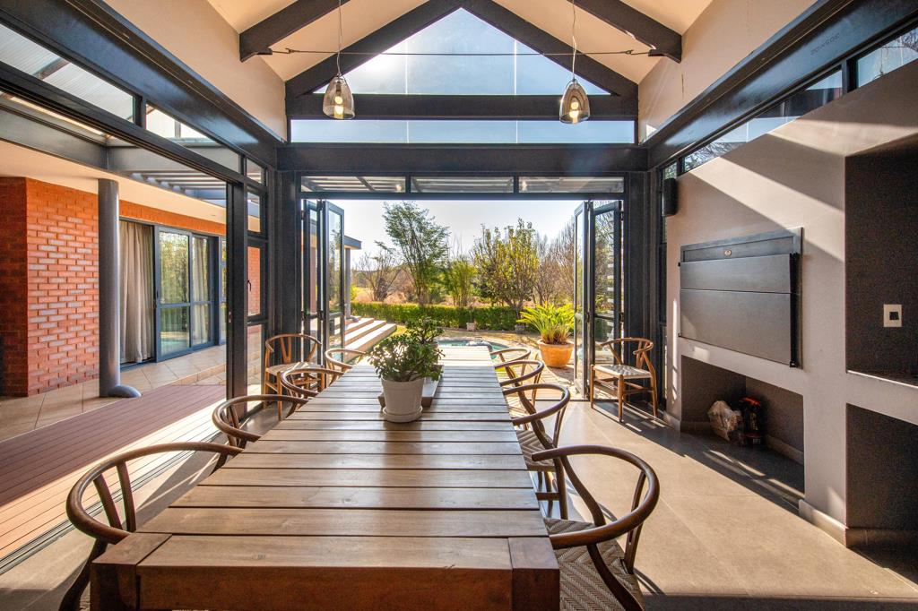 STUNNING POST-MODERN MASTERPIECE in sought-after SOUTHDOWNS ECO-SECURITY ESTATE - In the world of luxury real estate, the marriage of traditional and modern elements of FUSION ARCHITECTUREhas emerged as a CAPTIVATING DESIGN TREND - blending the warmth and charm of CLASSICAL AESTHETICS WITH THE SLEEK, TIMELESS INNOVATIVE FUNCTIONAL ASPECTS OF MODERN DESIGN in a lifestyle beyond compare living in utter peace and serenity in this one-of-a-kind unique charmed dreamy romantic Farm-style community ... LIKE LIVING IN THE COUNTRY - amid THE CITY .... Enter though distinctive imposing security entrance to a world lost in country-style beauty... Imposing entrance into amazing picturesque, cathedral-style high-ceilinged lounge, dining room open-hearth fireplace- to warm those cozy winter nights - open-plan modern kitchen in stunning fusion design leading out to a wonderful year-round patio overlooking the Designer circular Pool and beautifully landscaped garden ... 4 bedrooms plus huge fitted office or 4th bedroom all opening to the garden plus completely separate self-contained cottage ideal for a young couple or huge teenager suite 3 bathrooms (2 en suite) stunning master bedroom suite with full bathroom and unique double-indoor/outdoor-shower to die for!! ... plus, staff suite or 2nd cottage double garage with enchanting country-views abounding ...