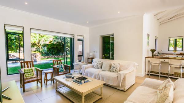 The elegant interiors include a dining room, TV room, stunning brick wine cellar, kitchen, and a cozy formal lounge featuring a gas fireplace connected to the estates piped gas system. Adjacent to the lounge is a guest bedroom with built-in cupboards, an en-suite bathroom, and direct garden accessan ideal space for visitors.