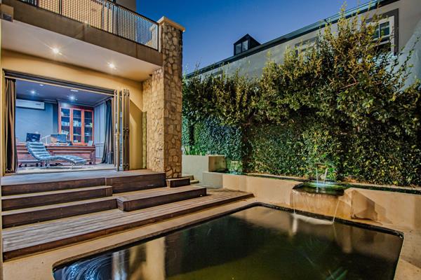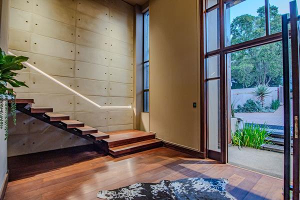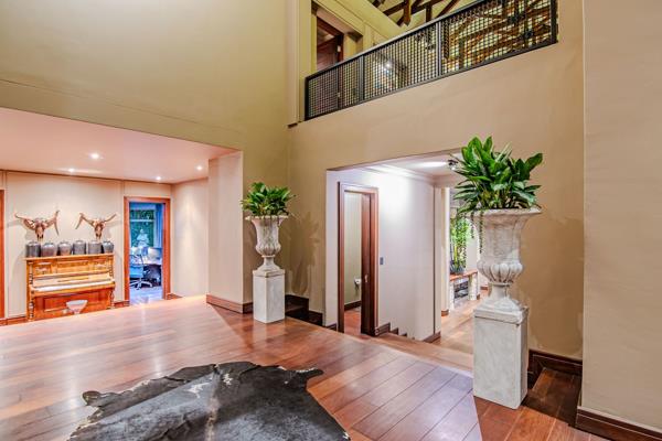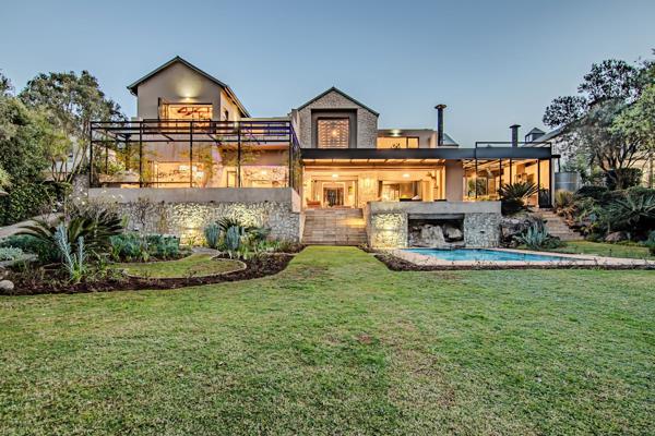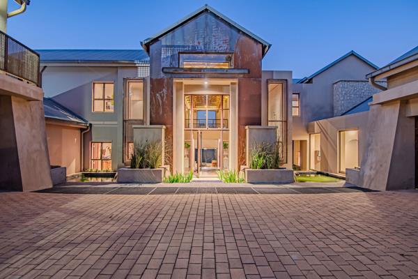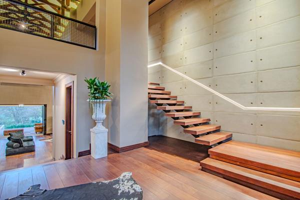 Bespoke Luxury Home on Riverfront with Flatlet. Exclusive Mandate. This harmonious design of this signature bespoke home offers both privacy and modern convenience. It forms part of a rare collection appreciated by discerning connoisseurs who demand the best. Majestic in scale, with soaring quadruple volume ceilings, bold lines and symmetry, this residence boasts a Control4 integrated home automation system, solid wood and natural stone flooring, exposed trusses, marble & Neolith finishes, as well as lush indigenous landscaped gardens.
