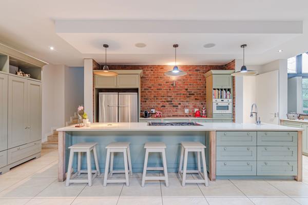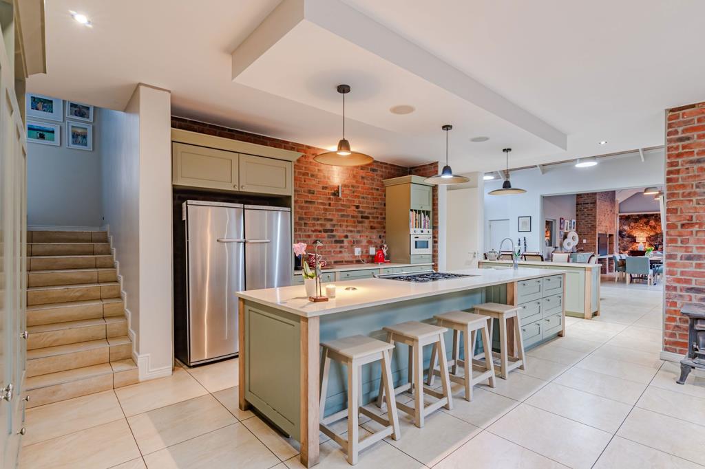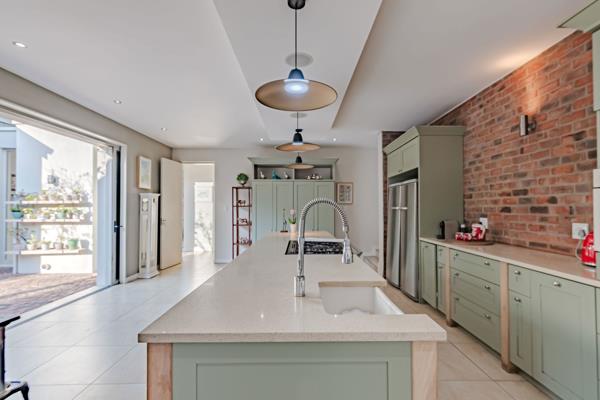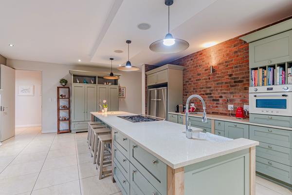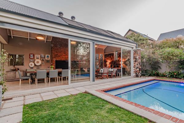 The inviting country-style kitchen features a STOVES gas stove with electric oven, SMEG microwave, Falkirk stove, bar counter, and sliding doors that open onto a sunny courtyard. From here, the dining room lies to the left and the cosy TV lounge to the right, each enhanced by a wood-burning fireplace. At the end of the living space, a large indoor braai and entertainment area extends effortlessly onto the garden and swimming pool through sliding doors perfect for year-round enjoyment.