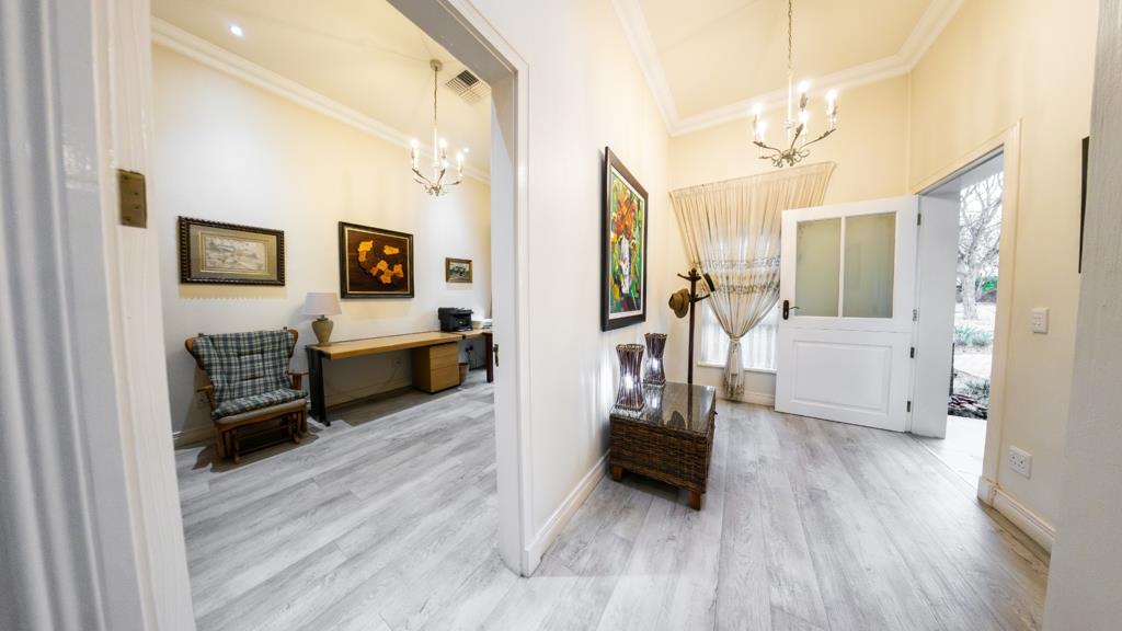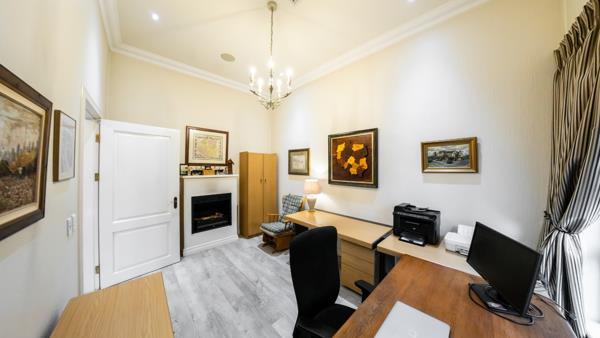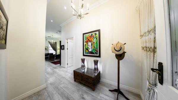 The chefs kitchen is well-appointed with, ample storage space, high-end Smeg gas stove and electric oven, a prep bowl, walk-in pantry, and small storeroom. There is a separate scullery/laundry area with a sliding door, separating the kitchen from this area, for added functionality. A short passage leads directly to the double garage, with an additional space for a golf cart or workshop, ideal for hobbyists or extra storage needs.