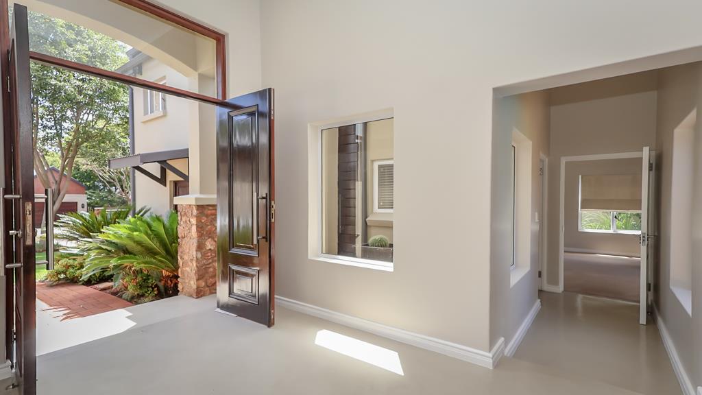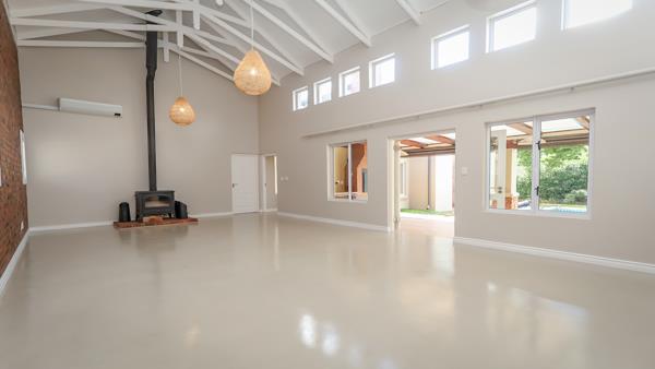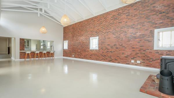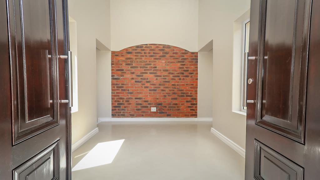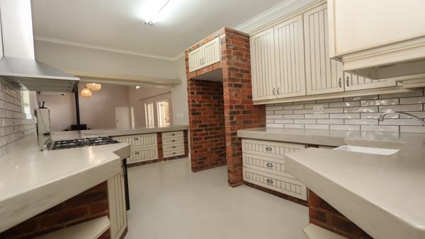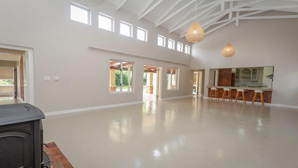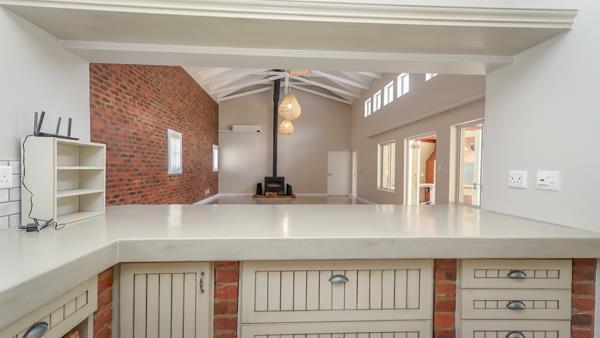 From the open-plan living area, double doors lead out to a generous patio with storage cupboards, a built-in braai, overlooking a sparkling swimming pool and a built-in bar, perfect for entertaining family and friends.