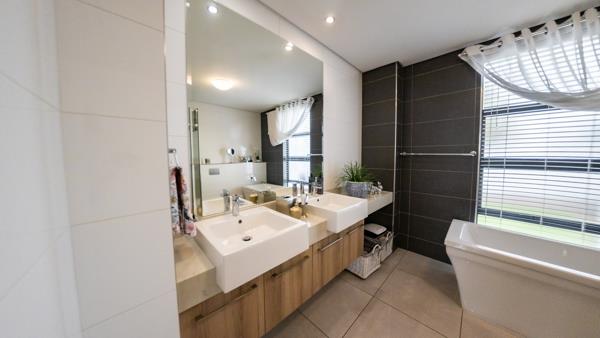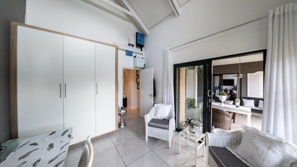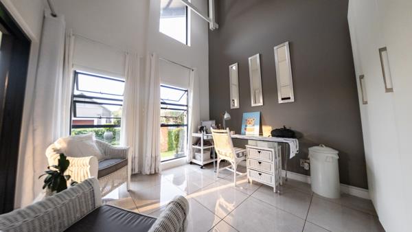 This immaculate townhouse offers the perfect blend of comfort, style, and privacy. Set in a peaceful location, it boasts a beautiful, manicured front garden visible from the front gate. It is situated close to the back access gate of the estate. Step outside to a spacious patio featuring a built-in gas braai and plenty of room for a small dining table and lounge seating, ideal for entertaining or relaxing outdoors. The kitchen seamlessly connects to the dining and family room, creating a spacious open-plan layout perfect for modern living. It features a stylish Caesarstone island with a gas hob and electric oven, offering both functionality and elegance. Ample storage and generous countertop space make it ideal for cooking and entertaining. A short passage leads to a separate scullery and laundry area, which provides convenient access to the back garden.